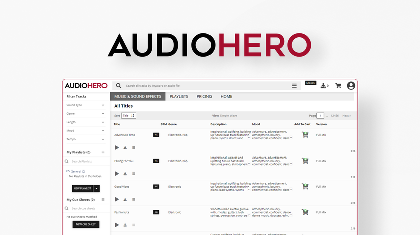 Finding the right music track or sound effect in AudioHero’s library is a piece of cake—just set a couple of filters (genre, length, mood, and tempo) and voila!